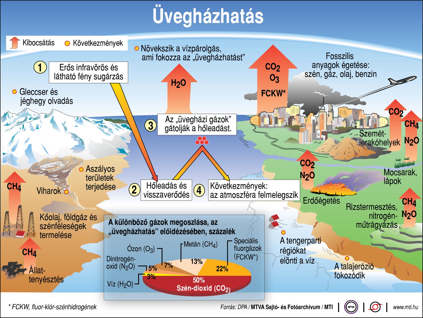 - Szén-dioxid: A természetben az élő szervezetek biológiai folyamataiból, vulkánok és óceánok működéséből ered. Az emberi tevékenység nyomán a fosszilis energiahordozók (kőolaj, földgáz, kőszén) elégetésével kerül legnagyobb mennyiségben a légkörbe. A legjelentősebb kibocsátók az erőművek, illetve az ipar és a közlekedés. A szén-dioxid légköri koncentrációjának növekedéséhez nagy mértékben hozzájárul a rohamos léptékű erdőirtás is, hiszen a szén-dioxid természetes megkötője a növényzet.